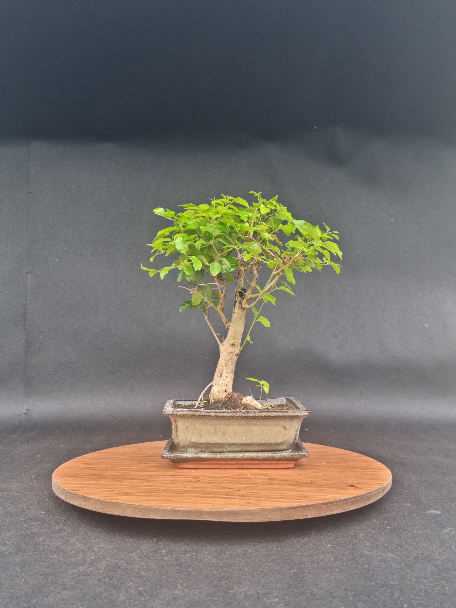 The Ligustrum Sinensis (Chinese Privet) bonsai is 6–8 years old, styled in the elegant broom form. Its dense foliage and balanced silhouette make it a charming addition to any indoor space.